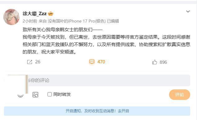 徐先生在微博上发文写到:“我母亲于今天被找到,但已离世,去世原因需要等待官方鉴定结果。这段时间感谢相关部门和蓝天救援队的不懈努力,以及所有提供线索、协助搜索和传播真实信息的朋友,祝大家平安顺遂。”