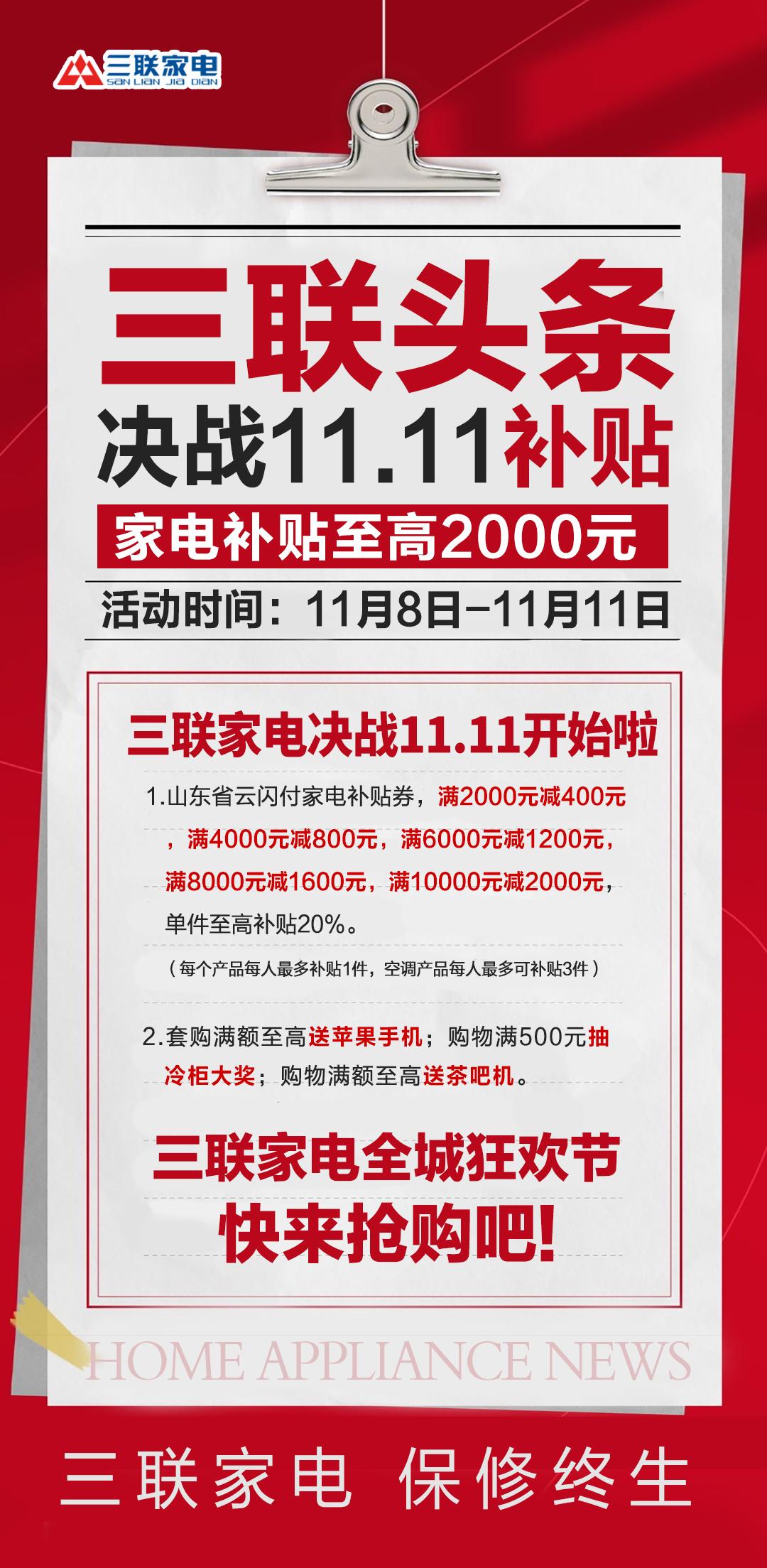 鲁网11月4日讯一年一度的消费盛宴如期而至,备受消费者期待的三联家电“11.11全城狂欢节”盛大启幕!三联家电为满足消费者对高品质家电的升级需求,三联家电通过“价格一步到位、补贴即领即用、服务全程护航”三大核心策略,打造省心、放心、舒心的家电消费体验。