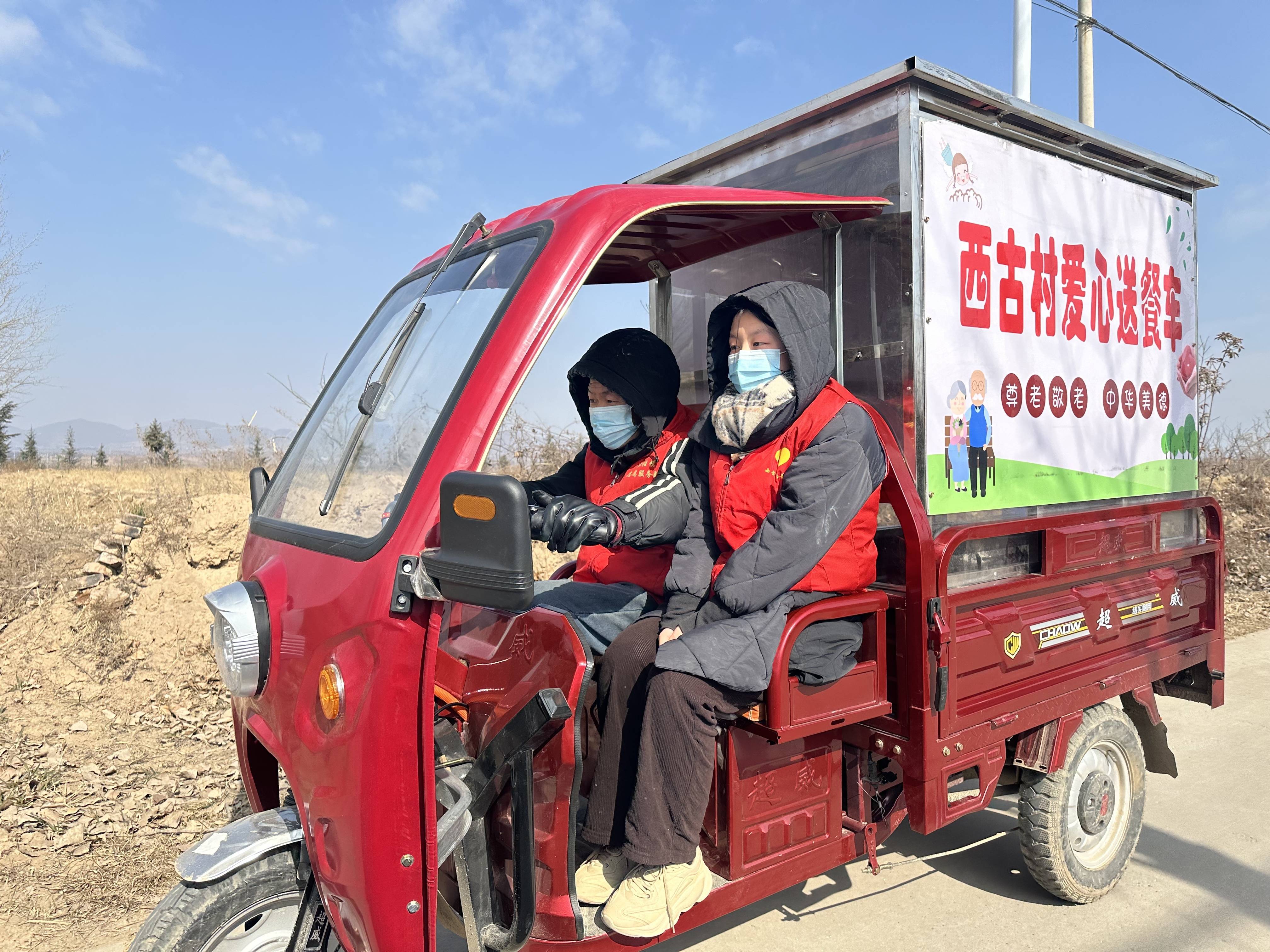 西古村德慈长者食堂志愿者童清华(右)、崔盼盼(左)在送餐路上。新华社记者 蔺娟 摄“今天需要送饭的老人有11个。”崔盼盼驾驶着三轮车再次出发。一旁的童清华双手紧握,寒风扑面而来,吹得她有些瑟瑟发抖。每到一户人家,他们就麻利地拉开车厢门,打开保温桶,把热乎的饭菜送到老人手中。